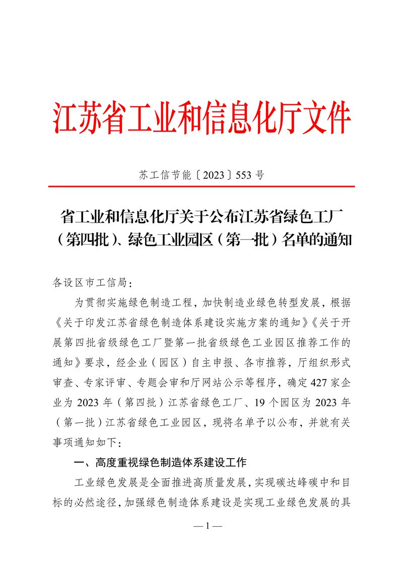 今日,接江苏省工业和信息化厅江苏省绿色工厂(第四批)名单的通知,我司荣获“江苏省绿色工厂”称号。