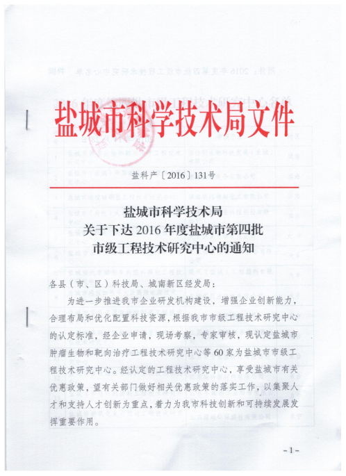 公司质量技术中心被认定为“盐城市市级工程技术中心”